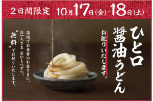 丸亀製麺は2025年10月17日・18日の2日間、店内で食事をした方に「ひと口醤油うどん」を無料で提供します。 ※駒澤大学店、東洋大学店、東京ドームシティ店は未実施 「ひと口醤油うどん」は、茹でたてのうどんを釜から引き上…