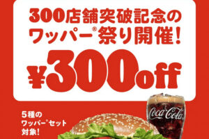 バーガーキングは300店舗突破を記念し、2025年10月20日〜24日の各日14時から、5種のワッパーセットが300円引きになるクーポンをアプリにて配布します。 クーポンの利用で、『ワッパー® チーズ セット』『ダブルワ…
