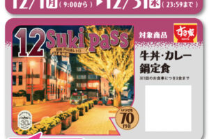 すき家は2025年12月1日9時より、牛丼・カレー・鍋定食などが70円引きになるお得なカード「Sukipass」を販売します。 利用対象商品は、店内・お持ち帰り両方の牛丼、カレー、鍋定食、牛丼ライト、お子様牛丼、お子様カ…
