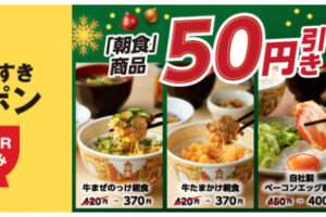 すき家は2025年12月1日9時〜31日10時59分の期間、アプリにて朝食商品が50円引きになるクーポンを配信します。 朝食商品の提供時間はAM5時~AM11時です。 対象となるのは朝食の全メイン商品。 クーポンは1回の…