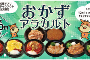 松屋は2025年12月1日10時〜29日の期間、アプリ限定のお得なテイクアウトまとめ買い「おかずアラカルト」を発売します。 「おかずアラカルト」は、対象の惣菜メニュー11種より、希望の種類・サイズで自由に組み合わせて、通…