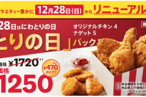 ケンタッキーは毎月28日は『にわとりの日』として、お得な「とりの日パック」を販売しています。 2025年12月28日も実施です。 今回から内容をリニューアルし、「オリジナルチキン」4ピースに、一口サイズで手軽につまめる「…