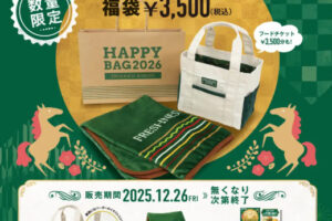 フレッシュネスバーガーは2025年12月26日より福袋「HAPPY BAG 2026」を販売します。 福袋は、フレッシュネスバーガーならではの“こだわり”を詰め込んだ特別な内容。 ブランドカラーを取り入れたナチュラルでか…