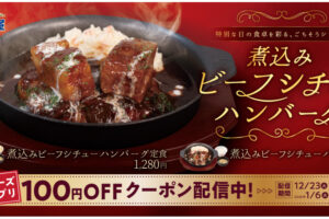 松屋は2025年12月23日10時より「煮込みビーフシチューハンバーグ」を販売します。 「煮込みビーフシチューハンバーグ」は、ごろっと大きな牛肉をとろっとろになるまでじっくり煮込み、赤ワイン仕立ての濃厚ソースで合わせたま…