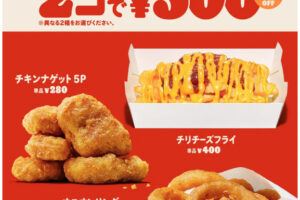 バーガーキングは2026年1月23日〜29日の各日14時から、人気サイドメニューが2個で500円になるキャンペーンを実施します。 キャンペーンでは、人気サイドメニュー『チキンナゲット 5ピース』『オニオンリング』『チリチ…