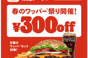バーガーキングは2026年3月2日〜6日の各日14時から、5種のワッパーセットが300円引きになるクーポンをアプリにて配布します。 クーポンの利用で、『ワッパー® チーズ セット』『ダブルワッパー® チーズ セット』『ス…
