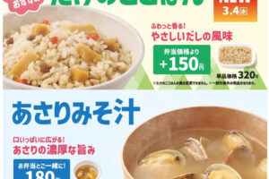 ほっともっとは2026年3月4日より、『たけのこごはん』と『あさりたっぷりみそ汁』を発売します。 『たけのこごはん』は、日高産昆布の“昆布だし”と焼津産かつお節の“かつおだし”をベースに、醤油、みりん、砂糖などで味を調え…