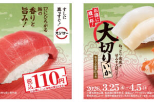 スシローは2026年3月25日より、「本鮪中とろ」「デカえび」「大切りいか」などをお得に販売しています。 「本鮪中とろ」を税込110円~で販売。 さらに、大きいサイズでお得に楽しめる「デカえび」や「大切りいか」を税込12…