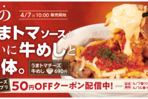 松屋は2026年4月7日10時より「うまトマチーズ牛めし」を販売します。 「うまトマチーズ牛めし」は、牛めしに濃厚なチーズをたっぷりのせて、その上から大胆にうまトマソースをかけた、食欲そそる一杯です。 うまトマソースが牛…