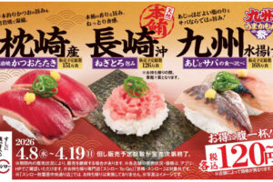 スシローは2026年4月8日より『九州うまかもん祭』を開催します。 フェアでは、「長崎沖 天然本鮪ねぎとろ包み」と「枕崎産 溶岩焼かつおたたき」、「あじとサバの食べ比べ」を税込120円~で提供。 そのほか、九州で獲れたネ…