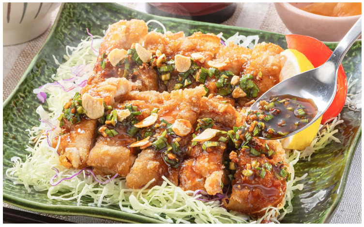 カリッと香ばしく揚げたジューシーな鶏肉に、特製の生ニラ香味だれがたっぷり絡む一品。