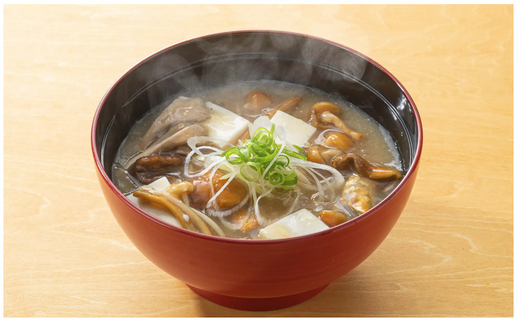 なめこ、茶えのき、舞茸の香り豊かな具材をたっぷり使った、満足感あふれる味噌汁。