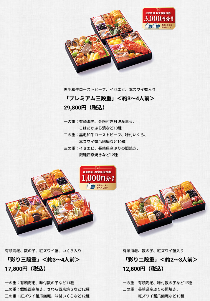 「プレミアム三段重」は、イセエビなどの豪華な料理をはじめ、有頭海老や数の子などのお正月らしい縁起の良い食材や“肉握り”にこだわるはま寿司らしい一品“黒毛和牛ローストビーフ”、本ズワイ蟹をゆずが香る幽庵のタレに漬け込み、旨みと風味はそのままに上品な味わいに仕立てた“本ズワイ蟹爪幽庵”など、32品目を詰め込んでいます。