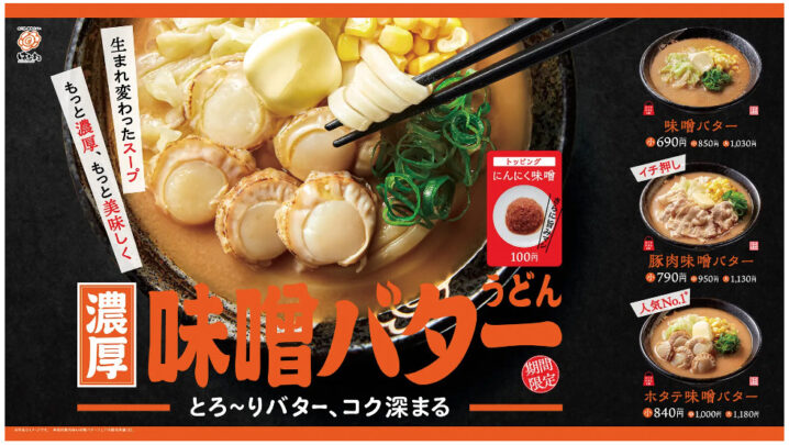 はなまるうどんは2025年10月9日〜11月中旬の期間、「味噌バター」「豚肉味噌バター」「ホタテ味噌バター」を販売しています。