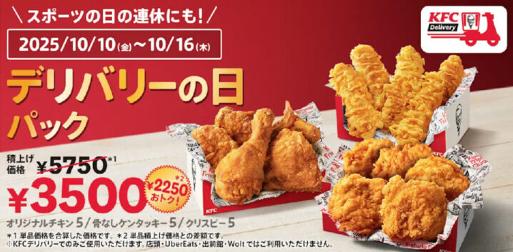 ケンタッキーは2025年10月10日〜16日の期間、お得に楽しめる「デリバリーの日パック」を発売しています。
