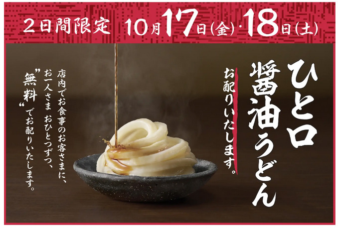 丸亀製麺は2025年10月17日・18日の2日間、店内で食事をした方に「ひと口醤油うどん」を無料で提供します。