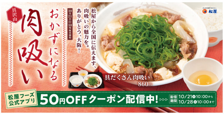 2025年10月21日10時~10月28日10時まで、モバイルクーポンにて注文すると、「具だくさん肉吸い」が50円引きになります。