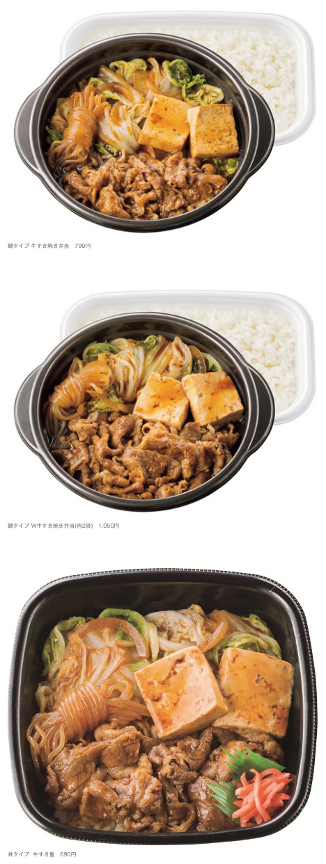 肉と野菜をしっかり楽しめる、鍋タイプの『牛すき焼き弁当』、牛肉の量が2倍の『W牛すき焼き弁当(肉2倍)』、丼タイプの『牛すき重』の3商品をラインアップいたします。