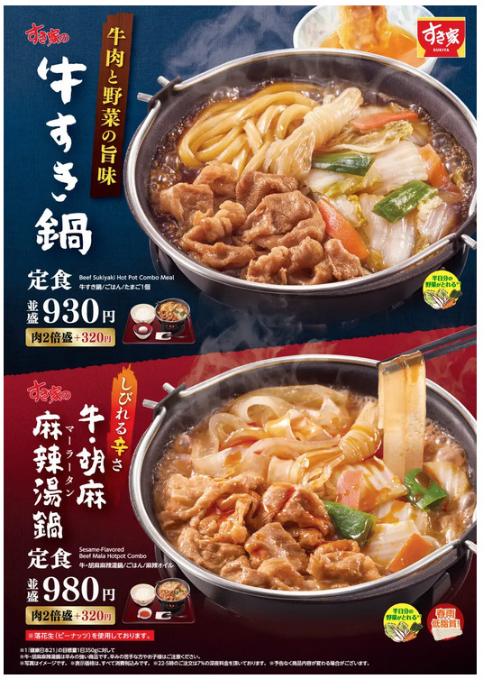 すき家は2025年10月28日9時より、「牛すき鍋定食」「牛・胡麻麻辣湯(マーラータン)鍋定食」を販売します。