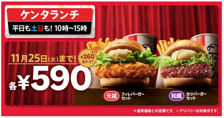 ケンタッキーは2025年10月29日〜11月25日のランチタイム、 「チキンフィレバーガーセット」と「和風チキンカツバーガーセット」を各590円で販売します。