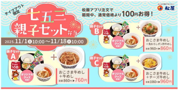 松屋は2025年11月1日10時〜18日10時の期間、アプリにてテイクアウト限定「七五三親子セット」を販売します。