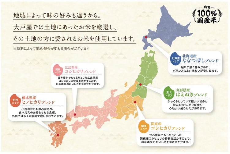 【関西エリア】広島県産コシヒカリブレンド:甘み豊かでもっちりとした広島県産コシヒカリの特長を活かすことで、お米本来のおいしさを引き立たせます。