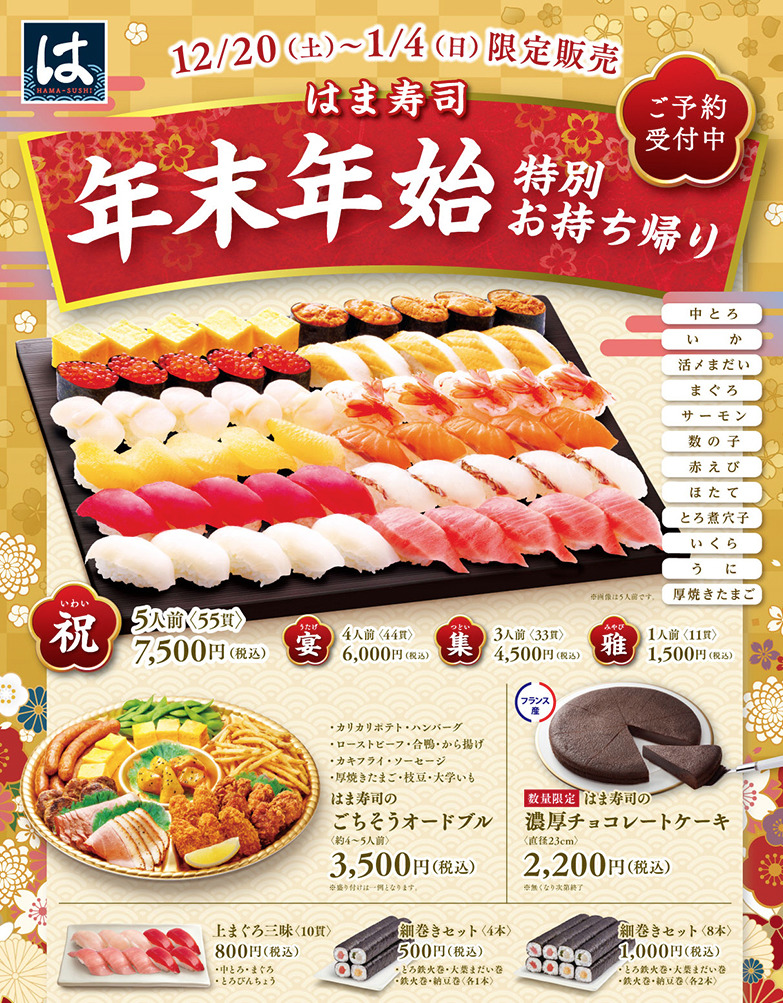 はま寿司は2025-2026年末年始の特別お持ち帰りメニューの予約を受け付けています。