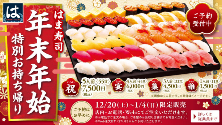 はま寿司は2025-2026年末年始の特別お持ち帰りメニューの予約を受け付けています。