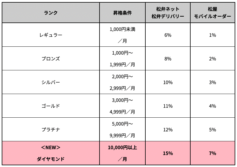 「ダイヤモンドランク」は「松弁ネット」「松弁デリバリー」の松屋ポイント付与率が15%、「松屋モバイルオーダー」の松屋ポイント付与率が7%となります。
