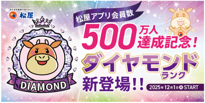 松屋は2025年12月1日より、アプリにて会員ランク制度に「ダイヤモンドランク」を新設します。