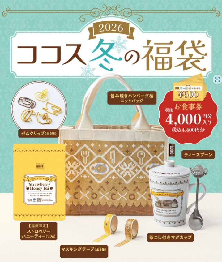 福袋は、紅茶を楽しめるセット(オリジナルフレーバーの茶葉30g、茶こし付きマグカップ、ティースプーン)に加え、税込4,400円分のお食事券や、冬らしいノルディック柄のニットバッグ、ココスオリジナルデザインのマスキングテープやゼムクリップが手に入るお得な内容です。