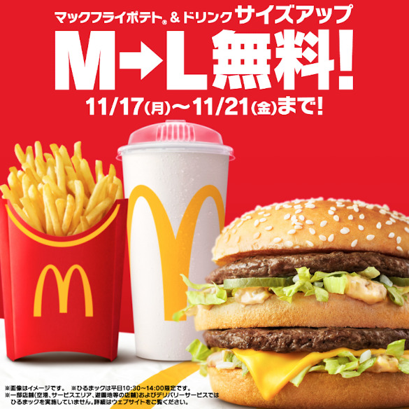 マクドナルドは2025年11月17日〜21日の期間、ひるまック限定でポテトとドリンクのサイズアップが無料になるキャンペーンを実施します。