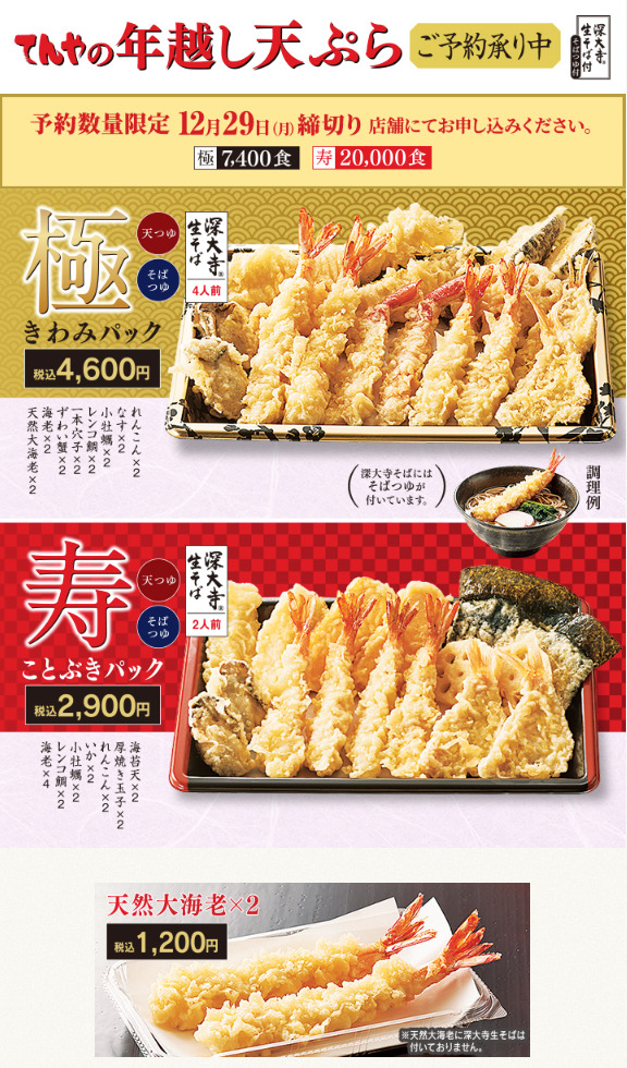 てんやは2025年11月24日〜12月29日の期間、「年越し天ぷら」の予約を受け付けます。