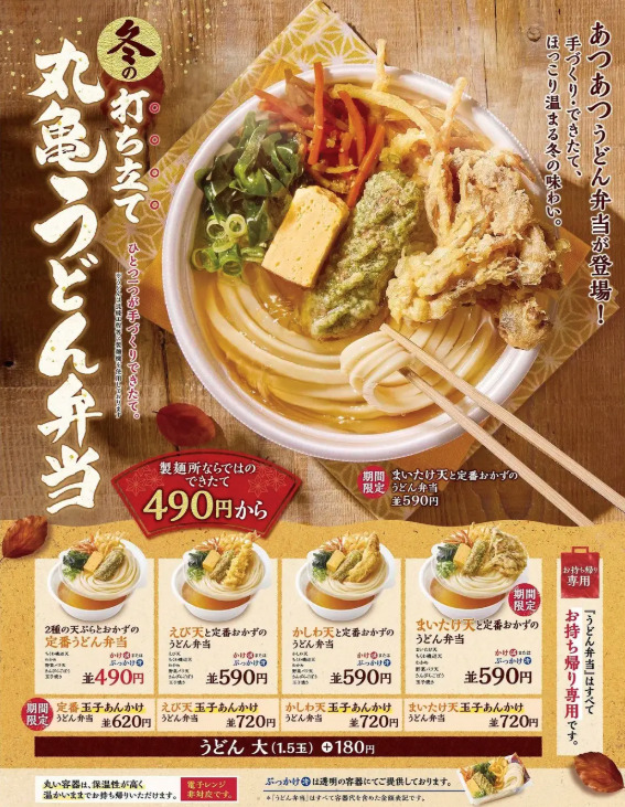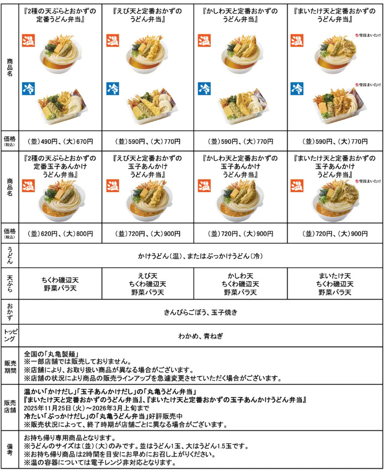 丸亀製麺は2025年11月25日より、あつあつの打ち立て「丸亀うどん弁当」を期間限定で発売します。