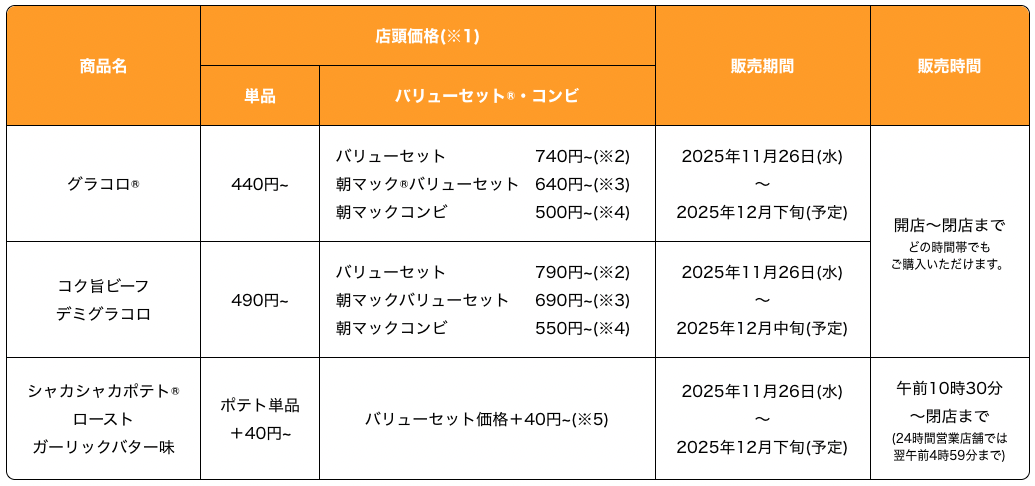 マクドナルドは2025年11月26日より、冬の定番「グラコロ」と新商品「コク旨ビーフデミグラコロ」を発売します。