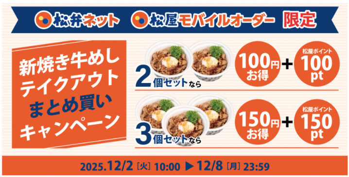 松屋は2025年12月2日〜8日の期間、松屋アプリ限定でまとめ買いがお得になる「新焼き牛めしテイクアウトまとめ買いキャンペーン」を開催します。