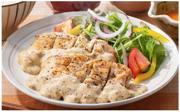 炭火でじっくり焼き上げたジューシーなチキンに、隠し味にチーズを加えたクリーミーな粒マスタードソースをたっぷりとかけています。