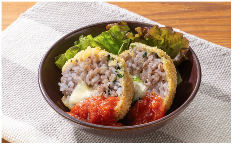 五穀ご飯とほうれん草、まろやかなチーズを包んだライスコロッケ。