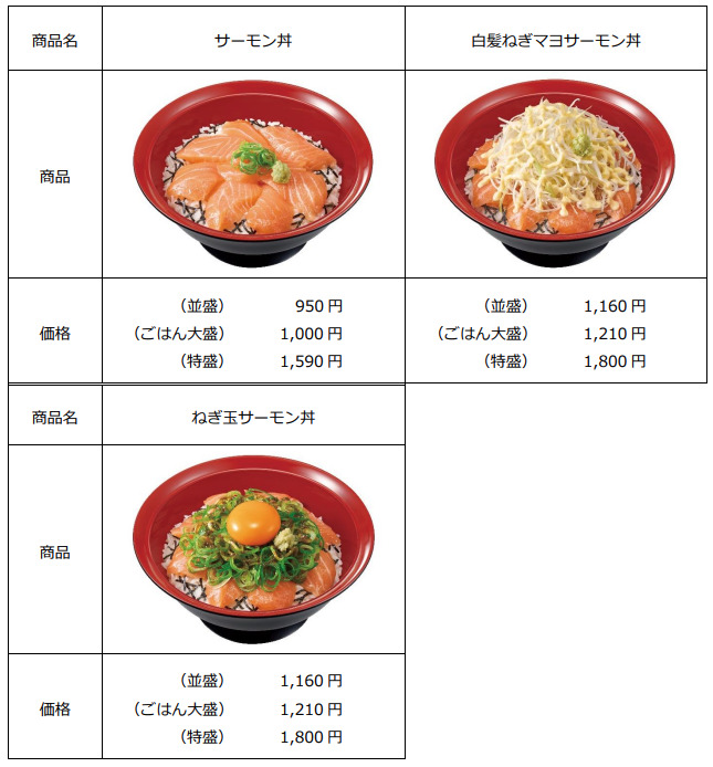 また、山盛りにしたシャキシャキの白髪ねぎとクリーミーなマヨネーズが絶妙にマッチした「白髪ねぎマヨサーモン丼」と、たっぷりの青ねぎとコチュジャンだれのやみつきになる味わいが食欲をそそる「ねぎ玉サーモン丼」も同時に販売します。