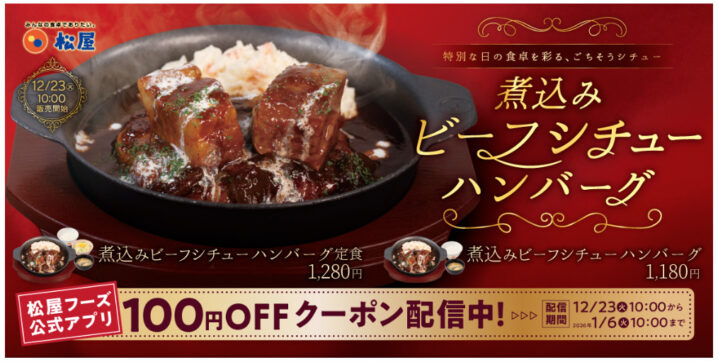 販売を記念して、2025年12月23日10時~2026年1月6日10時の期間、「煮込みビーフシチューハンバーグ100円引きクーポン」を松屋フーズ公式アプリにて配信します。