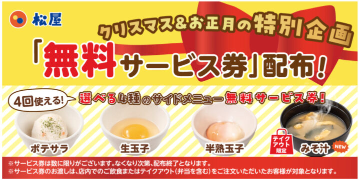 松屋は2025年12月25日〜2026年1月4日頃まで、「選べる4種のサイドメニュー無料サービス券」を配布します。