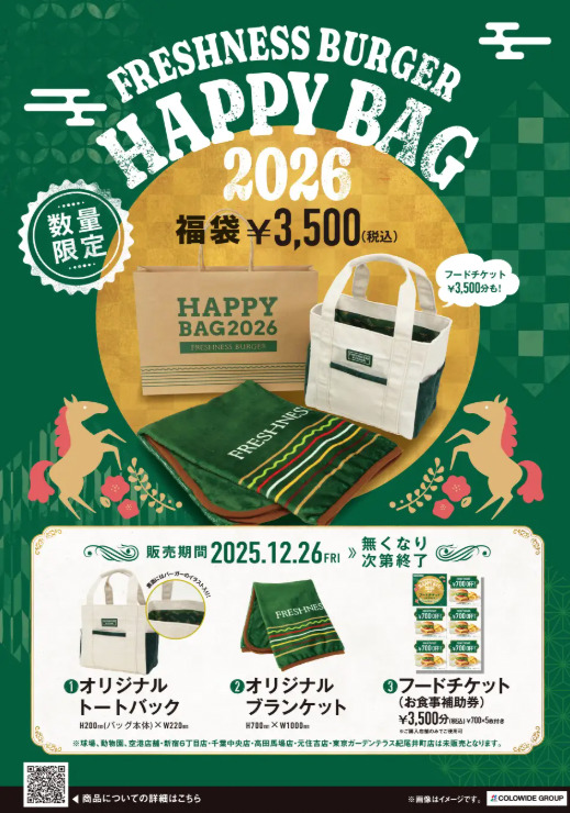 フレッシュネスバーガーは2025年12月26日より福袋「HAPPY BAG 2026」を販売します。