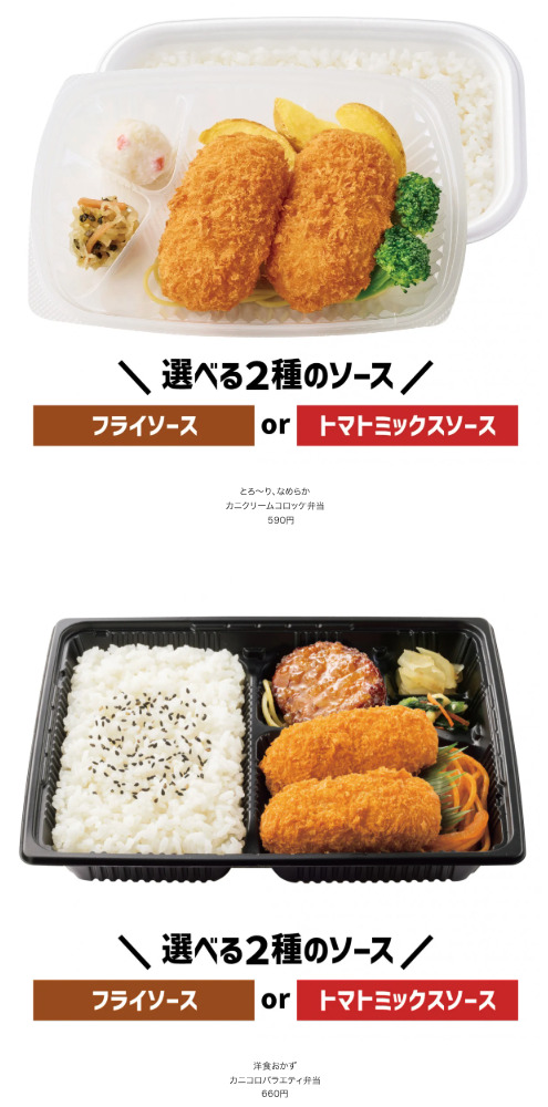 また、ミニハンバーグやナポリタンもセットになった『カニコロバラエティ弁当』や、カニクリームコロッケだけでなく、から揚・メンチカツ・エビフライなど様々なおかずを一度に味わえる『カニコロミックス弁当』、豪華洋食コンビを堪能できる『カニコロ&デミグラスハンバーグ弁当』も取り揃えます。