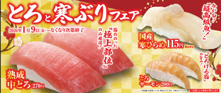 くら寿司は2026年1月9日より「とろと寒ぶりフェア」を期間限定で開催しています。