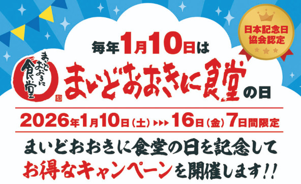 まいどおおきに食堂は2026年1月10日〜16日の期間、「まいどおおきに食堂の日」を記念してお得なキャンペーンを実施します。