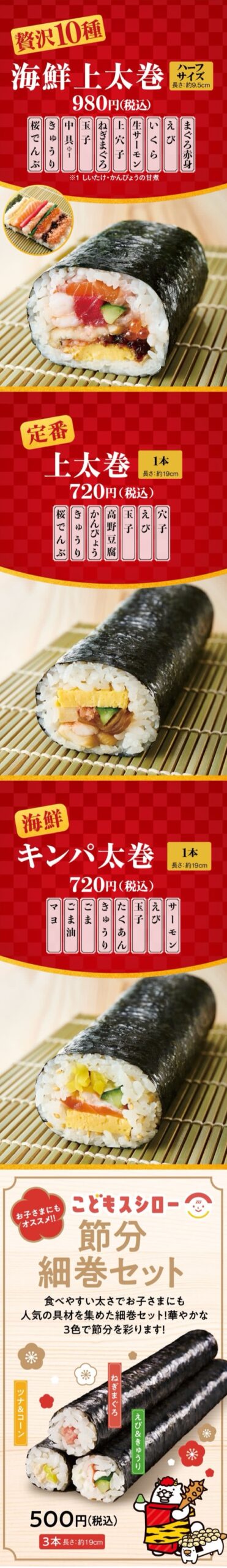 今年は、豪華な具材を使用しハーフサイズでご提供する「海鮮上太巻」をはじめ、「上太巻」、「キンパ太巻」、「節分細巻セット」を用意です。