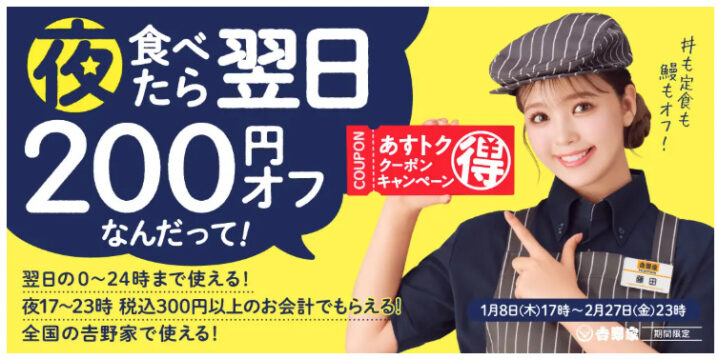 吉野家は2026年1月8日17時〜2月27日23時の期間、夜食べたら翌日200円引きになるキャンペーンを実施しています。