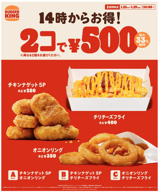 バーガーキングは2026年1月23日〜29日の各日14時から、人気サイドメニューが2個で500円になるキャンペーンを実施します。