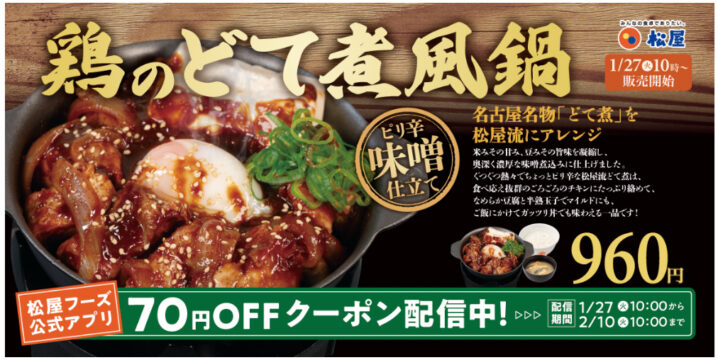 販売を記念して、2026年1月27日10時~2月10日10時の期間、「鶏のどて煮風鍋70円引きクーポン」を松屋フーズ公式アプリにて配信します。
