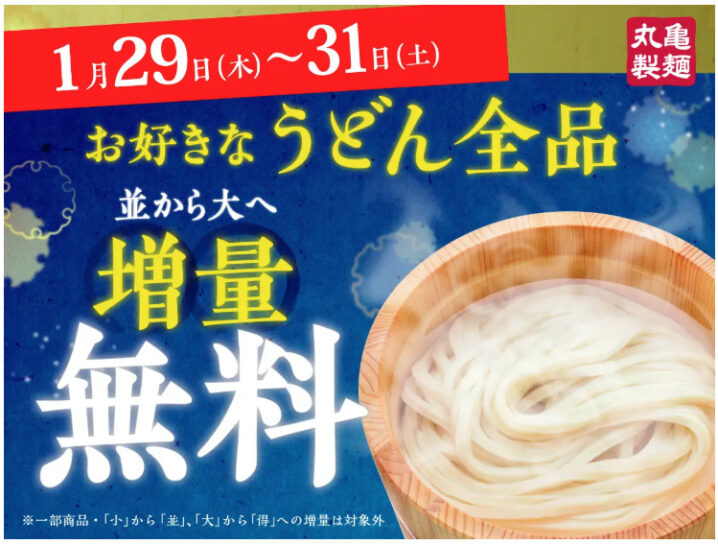 丸亀製麺は2026年1月29日〜31日の期間、麺増量無料キャンペーンを実施します。
